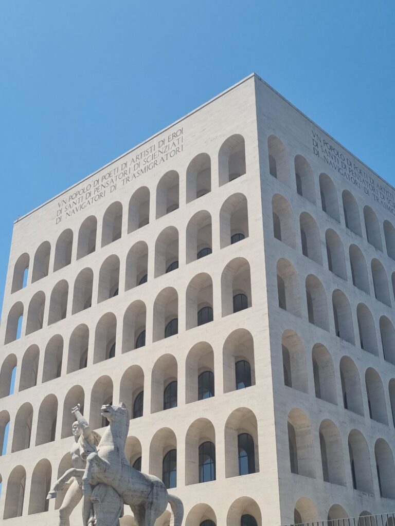Probably the most obvious way the architects have attempted to politicise the building was through reference to Italy’s national past, specifically the Roman Empire. Immediately upon looking at the Palazzo, the viewer can see that it directly references the most iconic symbol of Italy’s national past, the Colosseum. Not only that, but it was built using very Roman materials: travertine cladding and Carrara marble. However, the symbol of the Colosseum has been extremely stylised and modernised, reshaped from its signature amphitheatre into a cuboid, with a noticeable emphasis on clean lines and repetition. Through this kind of stylistic modernisation, which historian John Champagne calls ‘Classical Modernism’, the architects establish a direct link between ancient Rome and Fascist Italy. This kind of symbolic association was key to the Fascist visual lexicon, and allowed them to draw on and weaponise the cultural power of the national past while also creating visual markers of Italy’s modernisation and progress under Fascist rule. In this context, the use of Classical Modernism aims to frame the Fascist regime, through ancient Roman symbols, as not only the arbiters of national cultural regeneration, but a second coming of the Roman Empire.