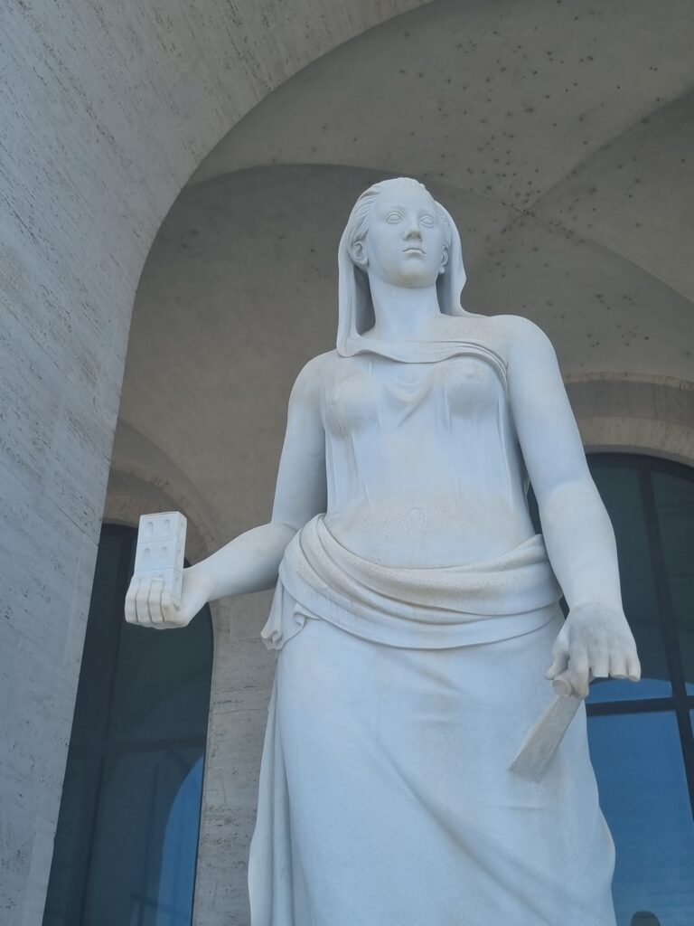 All of this is amplified when considering the statuary that lines the ground floor. Each decorating their own designated arches, the statuary depicts personifications of Fascist ideals, ranging from “civilised” principles such as law, mathematics, medicine, and navigation – a concept which here symbolically and culturally links the Fascists with the Futurist movement – to artistic concepts such as architecture, poetry, and theatre. Although in a general sense these concepts represent the Fascist ideal as a kind of jack-of-all trades capable of anything and everything, I want to localise my focus to the statue of Military Prowess. This statue, which stands immediately at the front entrance of the Palazzo, depicts an archetypal Roman soldier, wearing a laurel wreath around his head, and holding a sword. The soldier is the only statue who steps foot beyond his designated podium, and stands half in preparation, half in protection. Not only does this reference to the national past reinforce the idea that Fascism is ancient Rome reincarnated, but that Fascist culture is something that is and ought to be protected, ideally through violence.