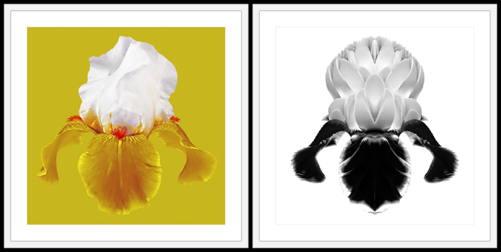 The phrase ‘a rose is a rose is a rose’ was written by Gertrude Stein as part of the 1913 poem ‘Sacred Emily’, which appeared in the 1922 book Geography and Plays. When asked what she meant by the line, Stein said that in the time of Homer, or of Chaucer, the poet could use the name of the thing and the thing was really there. As memory took it over, the thing lost its identity and she was trying to recover that. In paralleling my handmade coloured works with the monochrome AI-assisted works in this exhibition, I am simultaneously calling attention to both the equivalence and the difference in these images. There is also a secondary paralleling going on – that of my works positioned alongside Clare Crines’s paintings – similar subject matter, similar approach, similar attention to detail and context.