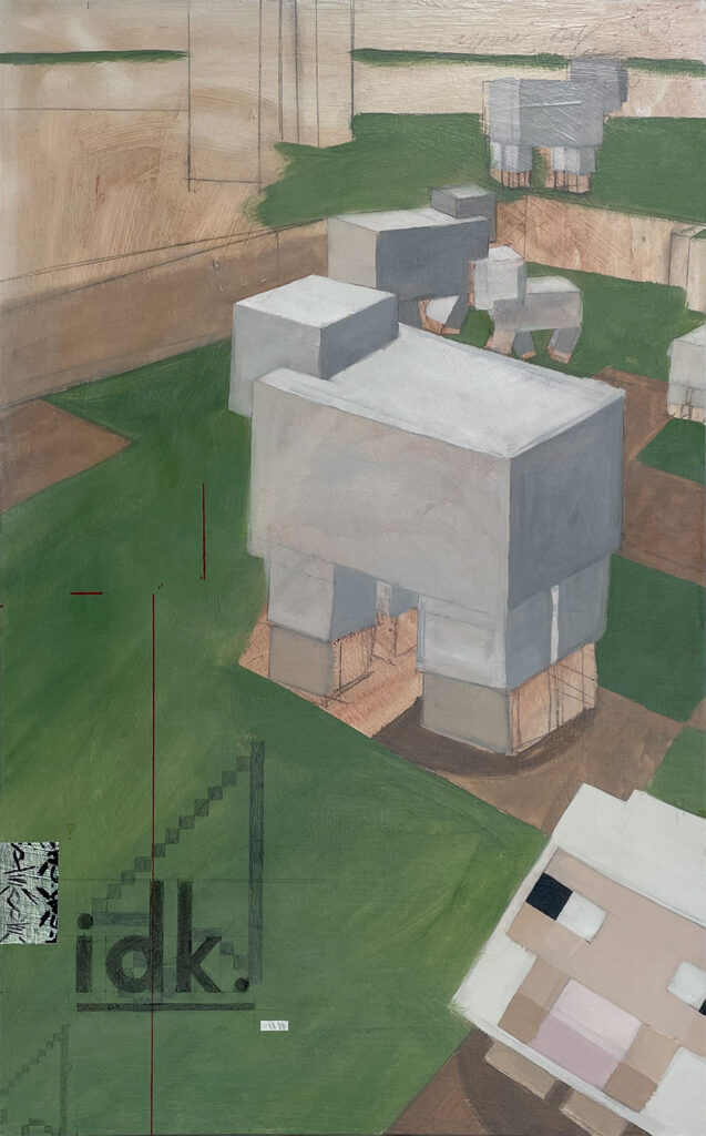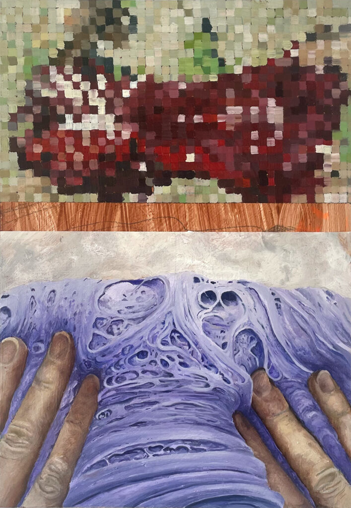 Their exhibition at Six Foot Gallery, A Glitch Ecology of the Electronic Sun acts as a vessel of immortalisation that preserves the tales of the animal protagonists in a dying ecosystem, displaced and transformed within the Anthropocene. Using painting as a method of checkmarking, traditional techniques become recontextualised in chaotic compositions. Natural expression collides against post-digital imagery, layered upon each other forming a dense cacophony of chaos and obscurity. Each piece is symbolic of our collective error in our everchanging relationship with the environment, inviting reflection on the absurdity, pain and grief of a mutating world.